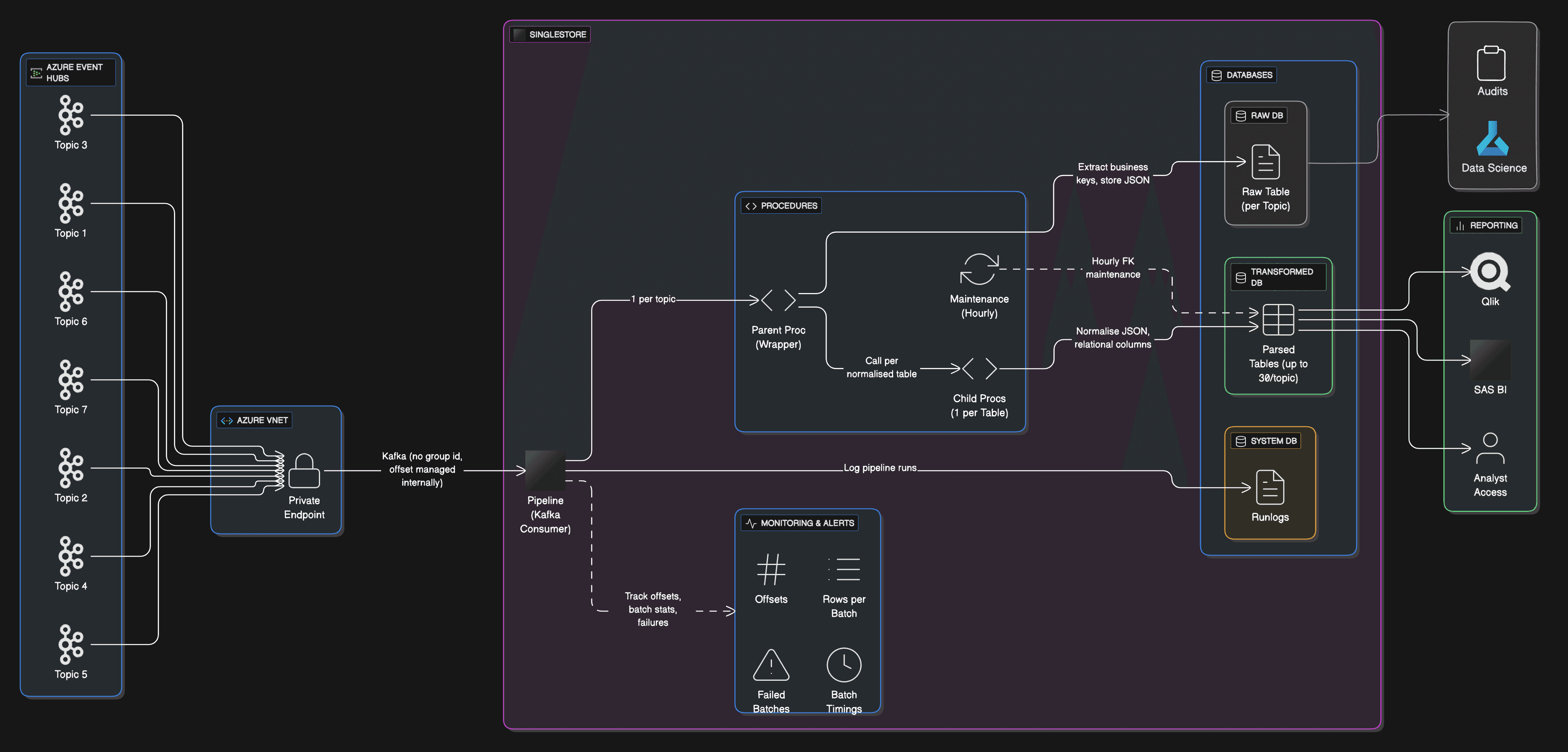 We built a warm ingestion pipeline that uses SingleStore's built-in Kafka pipeline support to consume JSON messages from Azure Event Hubs, store them in a raw JSON layer, normalize them into relational tables, and serve them to BI and analytics tools in near real time. The latency? Measured in milliseconds, even during fairly busy periods.